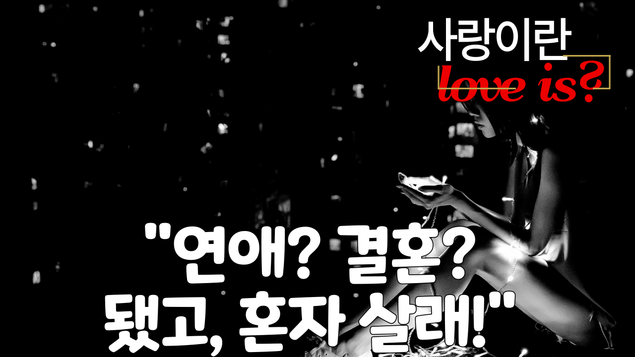 "결혼은 미친 짓이다!" vs "나 혼자 산다" 당신은 어느 쪽에 더 공감하시나요? 결혼과 출산율은 역대 최저, 1인 가구는 폭발적으로 증가하는 요즘, 솔로 이코노미 시대가 도래했습니다. 이제 결혼과 연애는 필수가 아닌 선택이 되었죠. 혼자여도 괜찮습니다. 당신은 혼자가 아닙니다.